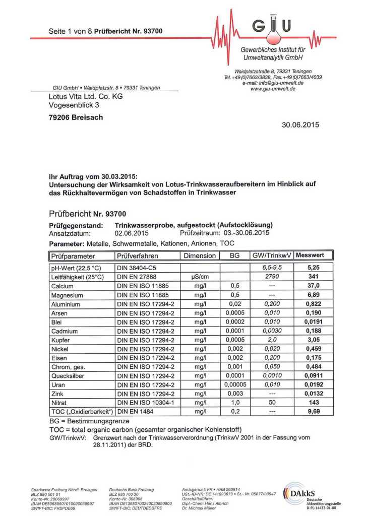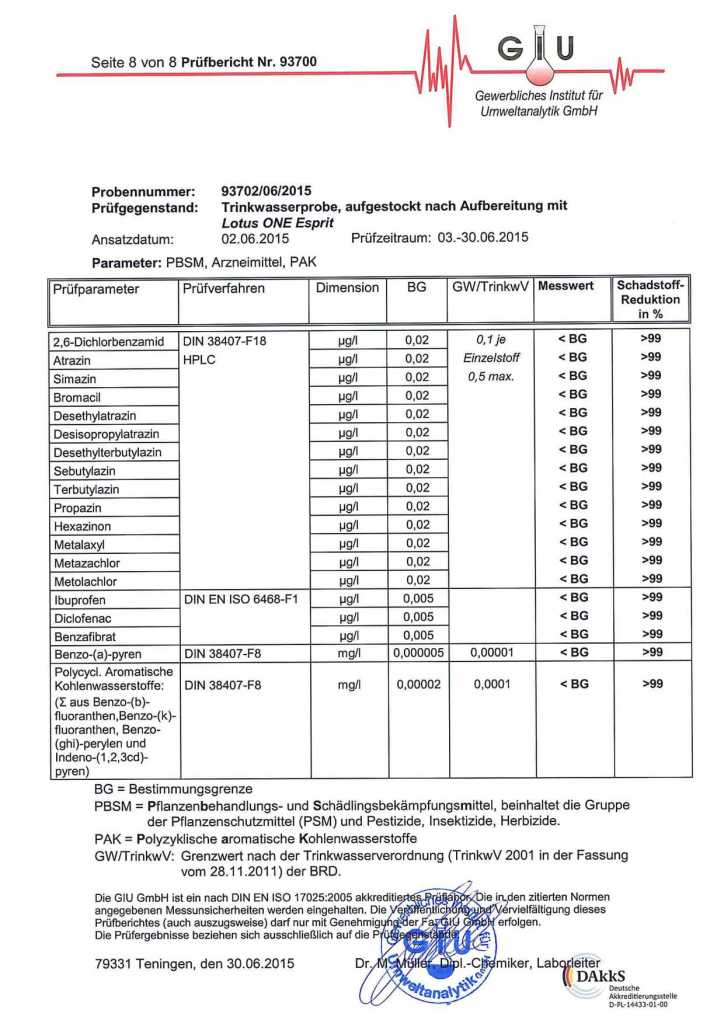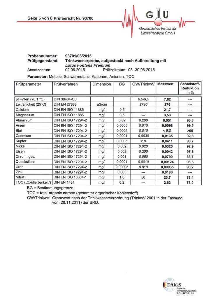 Como se esperaba, el análisis demostró que Lotus Fontana «es capaz de eliminar eficazmente los contenidos nocivos del agua … sin desmineralizar el agua». Obtenga más información sobre la prueba en detalle y estudie el informe del análisis.